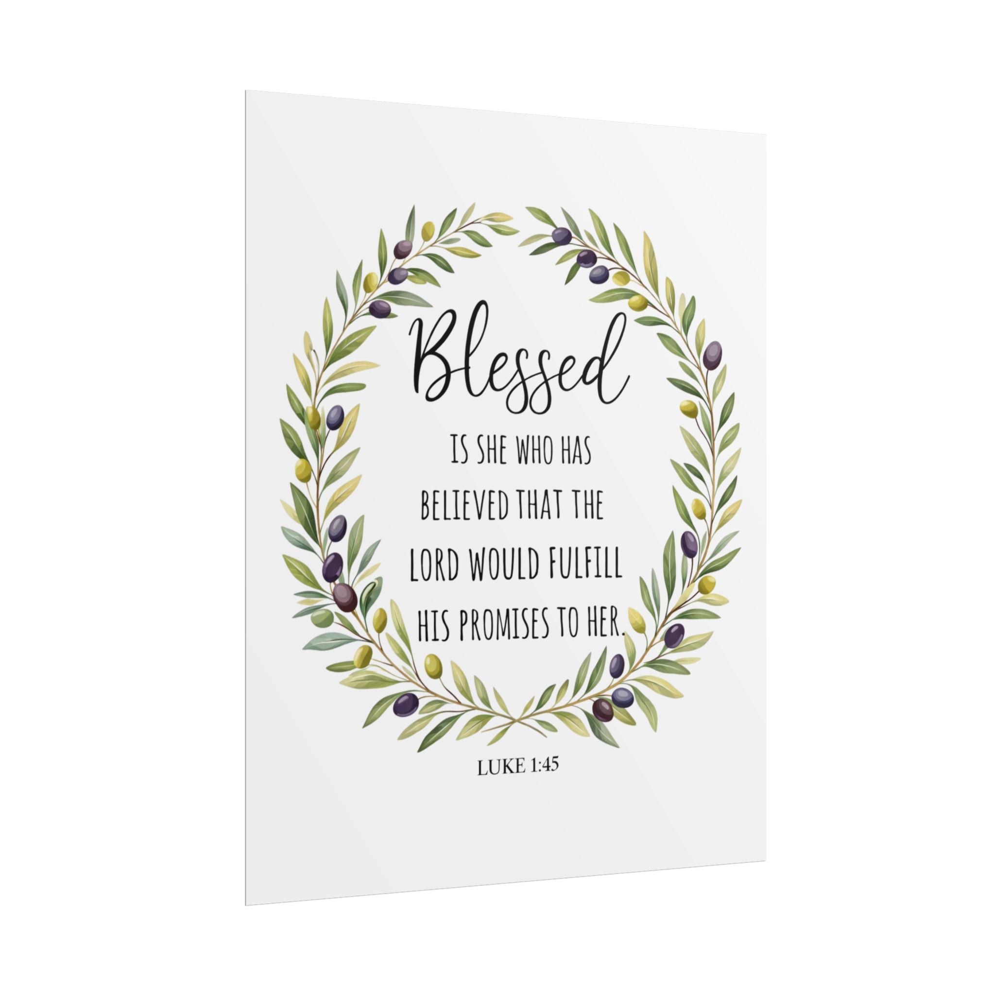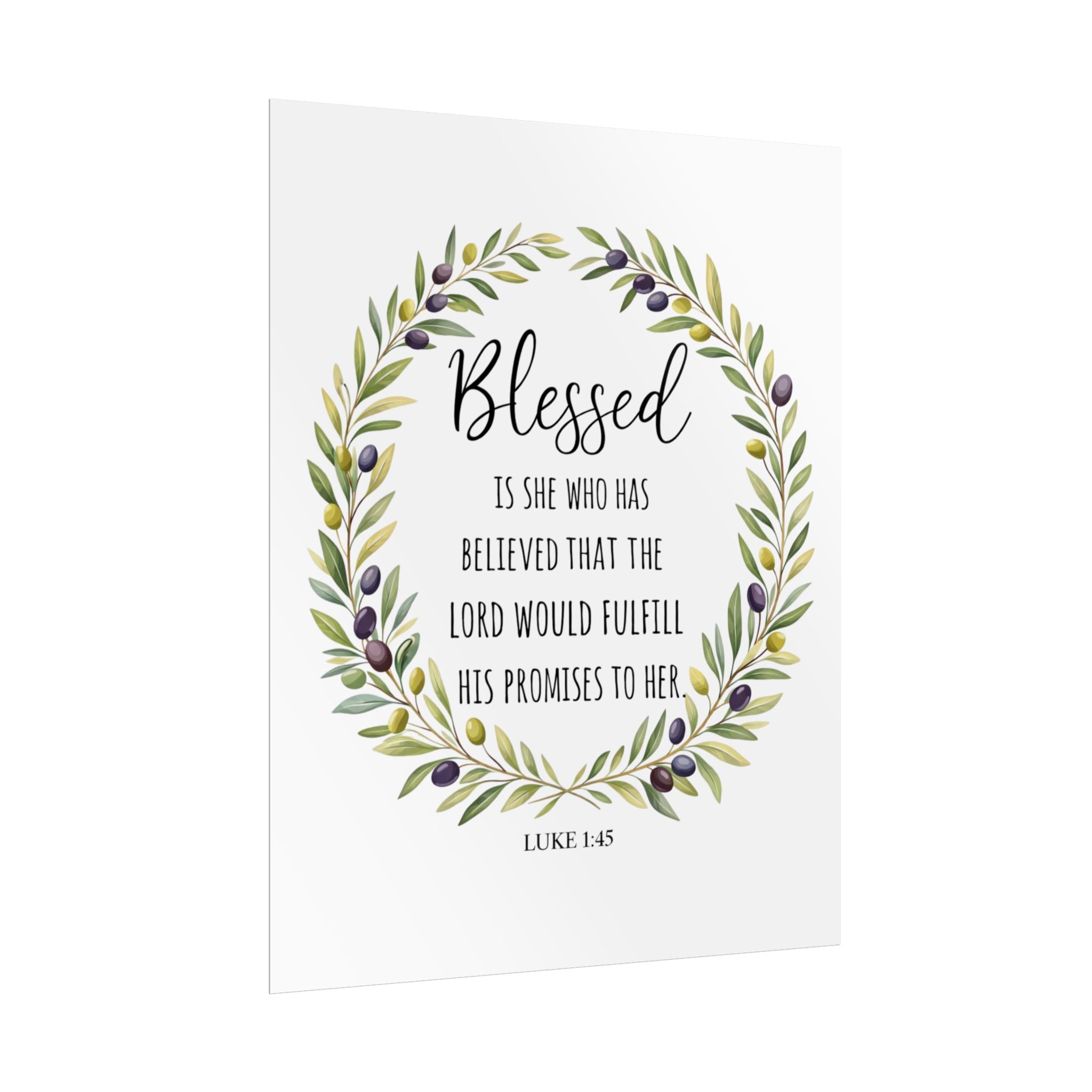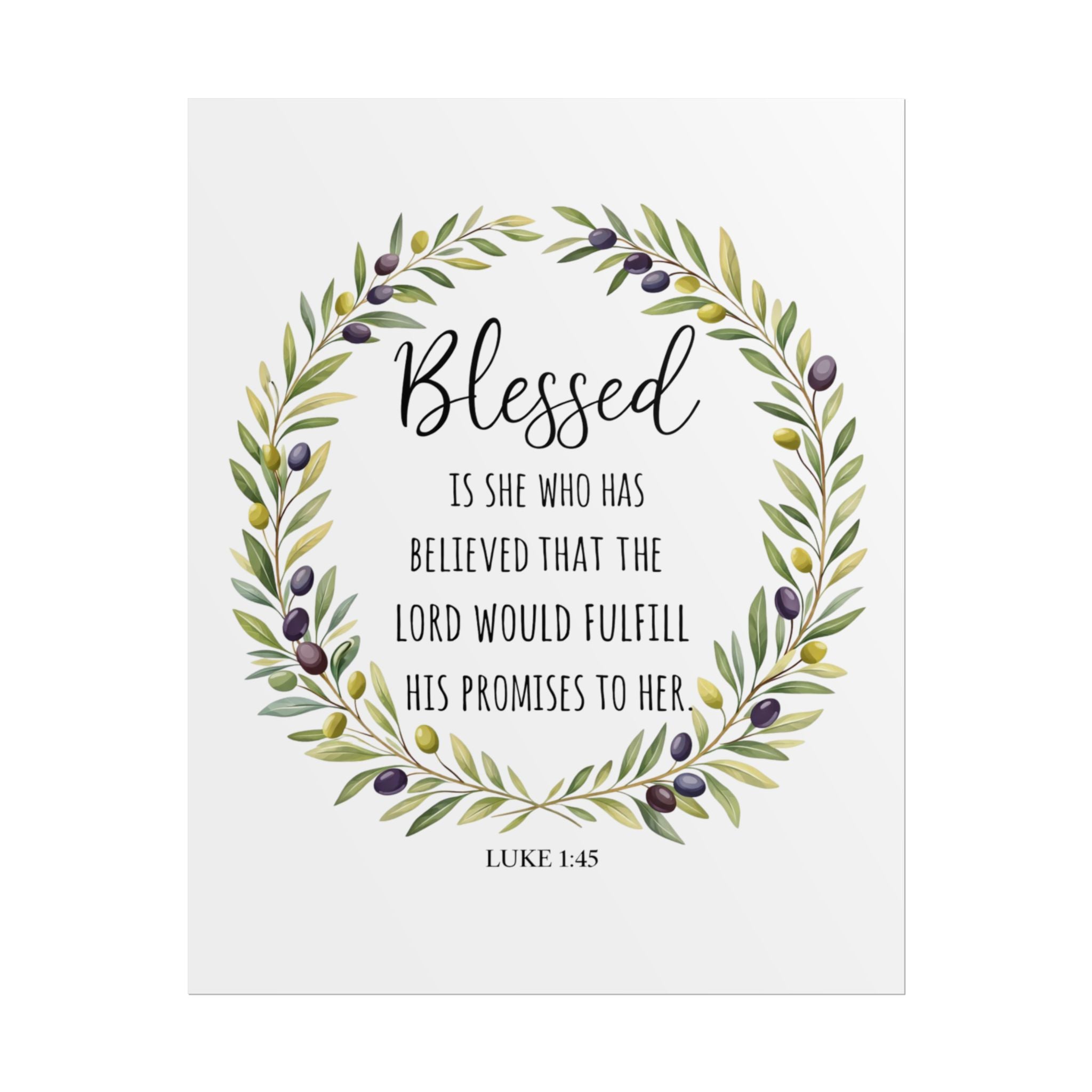 A rolled art poster that brings a quiet, faith-filled presence to any wall. Soft watercolor olive branches form a gentle wreath around the word “Blessed,” while a small Luke 1:45 verse sits below—simple, reverent, and warm. Printed with archival-quality options to keep the greens and muted purples true, this piece reads like a whispered encouragement each time you pass by. It slips into entryways, bedrooms, or cozy reading nooks and settles into everyday life without shouting—just steady comfort and a reminder of grace.