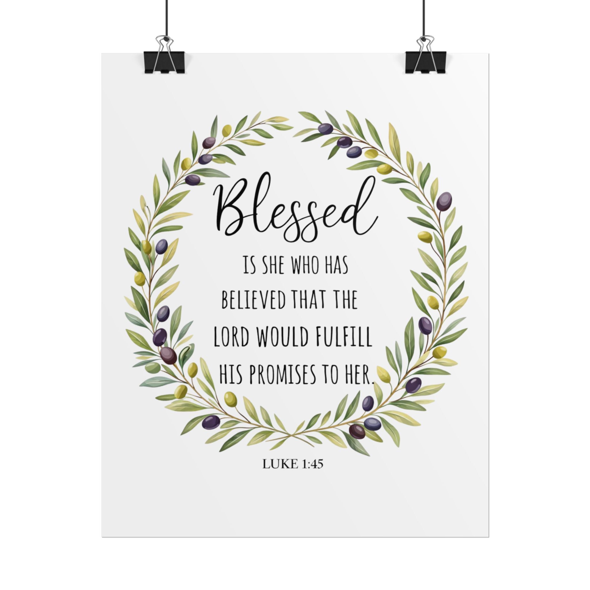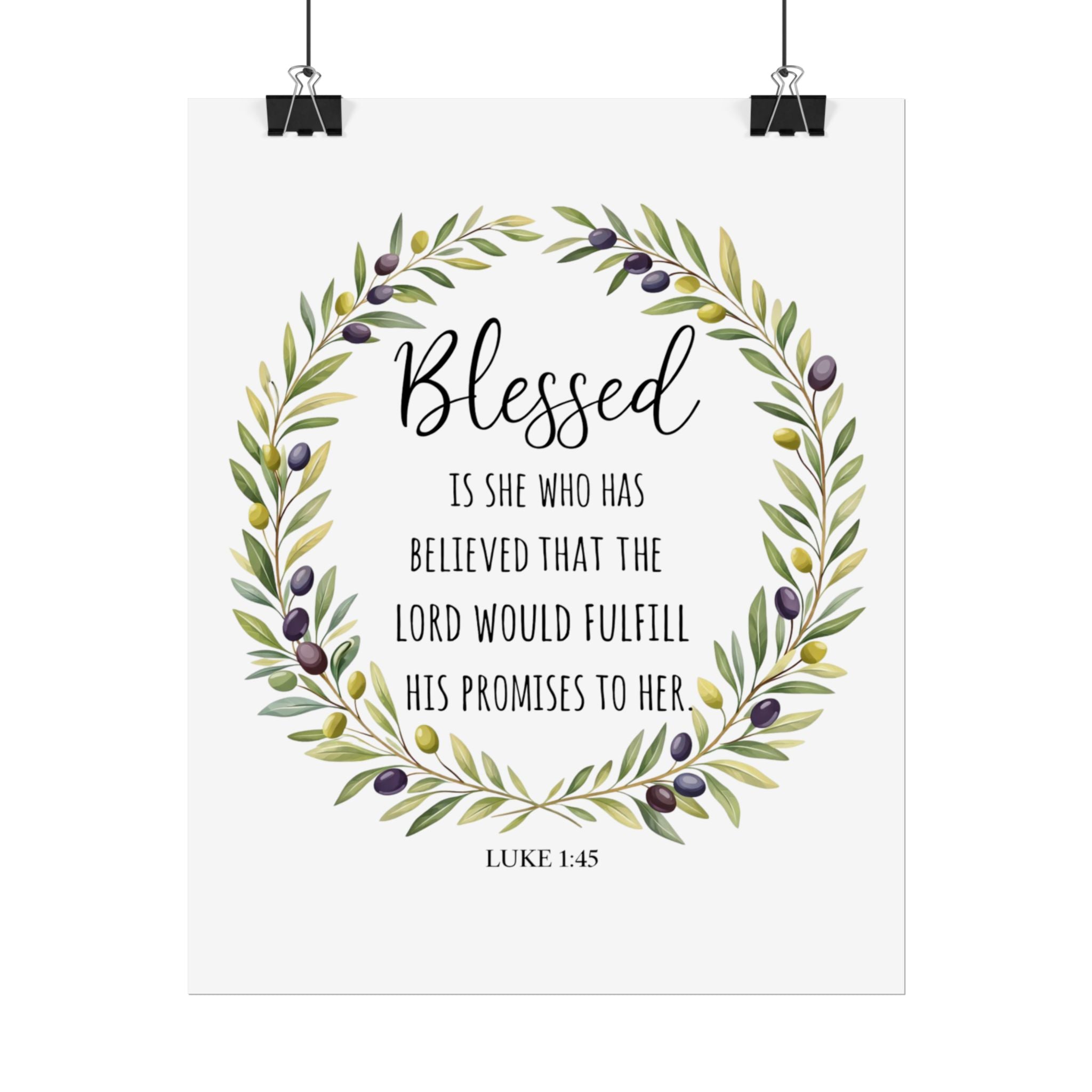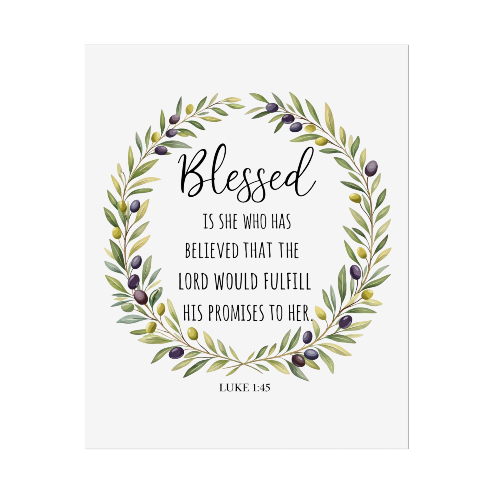 A rolled art poster that brings a quiet, faith-filled presence to any wall. Soft watercolor olive branches form a gentle wreath around the word “Blessed,” while a small Luke 1:45 verse sits below—simple, reverent, and warm. Printed with archival-quality options to keep the greens and muted purples true, this piece reads like a whispered encouragement each time you pass by. It slips into entryways, bedrooms, or cozy reading nooks and settles into everyday life without shouting—just steady comfort and a reminder of grace.